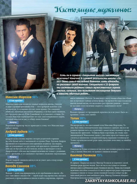 Ко Дню защитника Отечества редакторы журнала «Закрытая школа» приготовили для своих читателей очередной сюрприз. Они составили рейтинг мужчин из актёрского состава сериала. Интересно узнать кто возглавляет рейтинг, кого назвали настоящим мужчиной? Тогда читайте новый номер журнала. Агата Муциниеце рассказывает о своих трудностях и проблемах, а также поделится пикантными подробностями личной жизни. Евгения Осипова делится впечатлениями от съёмок в фильмах комедийного жанра. Игорь Юртаев расскажет очередную тайну о воинах, которые имеют сверхсилу. Как всегда, в комплекте с журналом подарок. На этот раз это – игровое поле для игры «Закрытая школа».